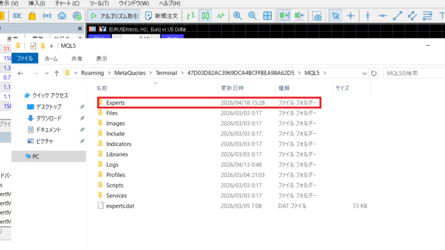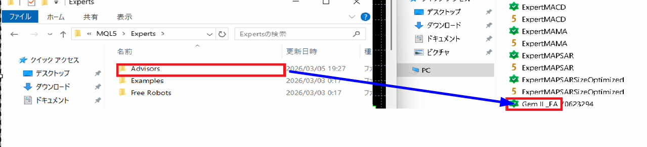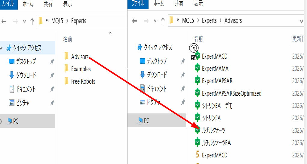 ②MT4の「ファイル」→「データフォルダ」→「MQL5」→「Experts」→「Advisors」の順に開き「ルチルクオーツEA .ex5」もしくは「シトリンEA .ex5」を