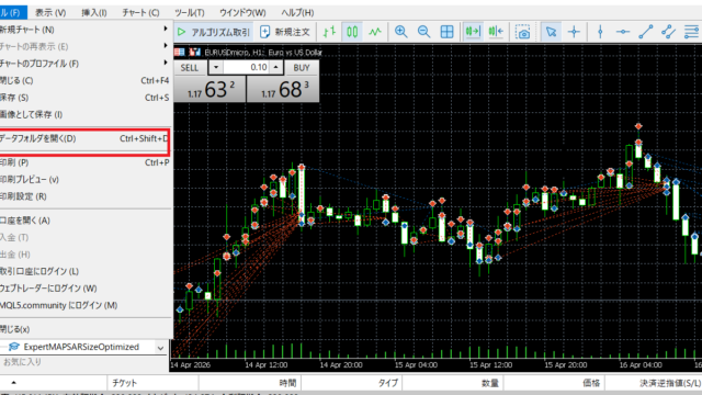 ①MT5を起動する。起動したらMT5の「ファイル」タブの「データフォルダを開く」をクリック